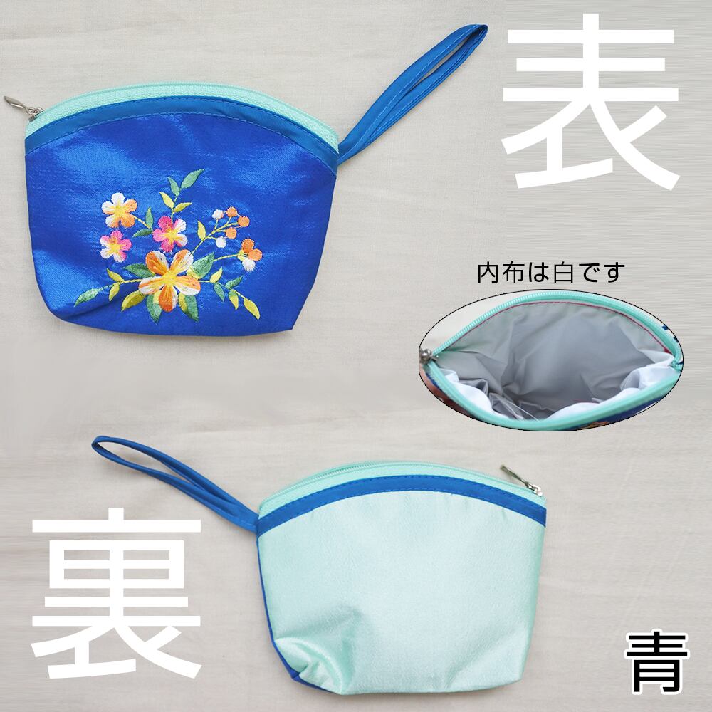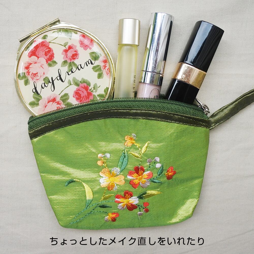シルク生地に手縫いの花刺繍をあしらったミニポーチです。色は3種類。